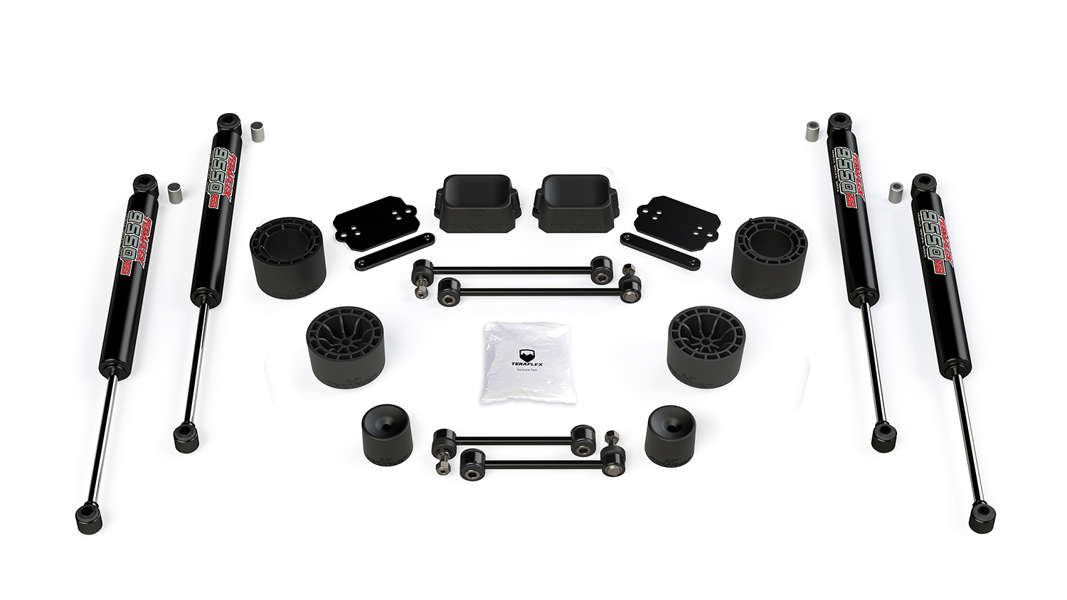 2,5 Inch Performance Spacer Lift Kits are offered with TeraFlex 9550 VSS Twin-Tube Shocks, with shock extensions, or without shock absorbers or extensions,